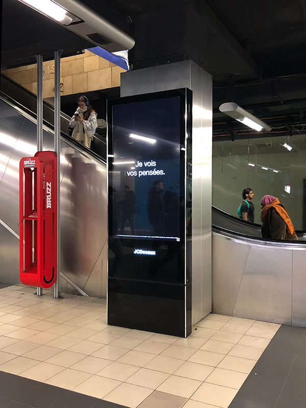 Détournement d'écrans publicitaires, 2025-2026Dans les écrans de quatre stations du métro Bruxellois, les publicités alternent avec de brefs textes qui s’adressent aux voyageurs : « Je lis dans vos yeux », « Je vois vos pensées », « Je vends vos regards », etc. Ces écrans semblent ainsi avoir un quant-à-soi et révéler leur aptitude à nous écouter, à nous observer et à faire usage de nos données.
